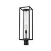 Illuminate spacious decks and patio verandas with this modern outdoor post mounted fixture from the Dunbroch collection. Featuring an open, airy rectangular lantern, this outdoor patio fixture can be mounted on railings or landscape posts to cast a soothing glow. This outdoor light fixture also features a striking, dark black aluminum frame, along with a single light set inside a clear glass cylindrical globe, lending a classic, yet contemporary style to any landscape.