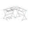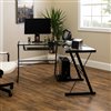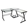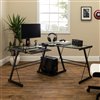 Modernize your home office or study with this corner computer desk. Crafted from durable steel with a powder coat finish and thick, tempered safety glass. The L-shape design provides the perfect fit for space-saving needs and features a sliding keyboard tray and CPU stand. Its flexible configuration allows you to mount the tray on either side of the desk according to your needs.