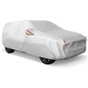 Shield your SUV with a durable car cover featuring aluminum film and cotton lining. The full cover offers resistance against snow, rain, sun, leaves, bird droppings, and dust, providing 360° protection. Enjoy user-friendly features like mirror pockets, elastic bands, windproof buckles, and reflective strips for night visibility. Ideal for an SUV up to 190-in long, it fits models like Chevrolet Equinox, Hyundai Santa Fe, Kia Sorento, Mazda CX-50/CX-5, Mitsubishi Outlander, Nissan Rogue, Subaru Forester, and Subaru Outback. After use, simply store it in the included compact bag for effortless handling at home or on the go. If your car model isn't one of the models previously listed, please choose the matching car length and make sure it's an SUV.