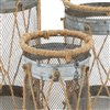 - This candle lantern set has a silver finish and natural brown rope