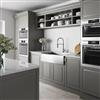 - Single hole kitchen faucet and farmhouse-style apron front sink create a modern look