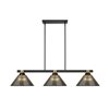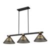 Smoky conical shades create a hint of mystery for this modern three-light billiards pendant. Its clean-lined structure adds linear appeal, perfect for a pool table or dining room. A matte black finish completes the look with hints of rubbed brass, delivering just the right touch of warmth and sophistication.