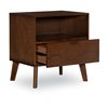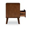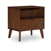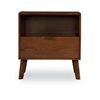 A mid-century modern bedroom nightstand with stylish bronze hardware, this distinguished table offers both closed and open storage. Ash veneer in a medium brown walnut stain bring out the natural grain formations. Four tapered legs are the only assembly needed on this stunning piece. Matching 2-Drawer nightstand and four-drawer chest available in this collection.