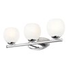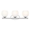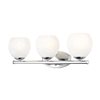 A trio of rounded glass shades, each with a feathered opaque white swirl design, create inviting, bright illumination for a transitional 3-light vanity bath fixture. Perfect for primary and guest suites alike, it showcases a gleaming chrome finish that is both timeless and on-trend. The design is complete with graceful curves in its wall plate and a straight bar and minimalist cups that secure each light.
