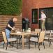 Timeless and elegant profile to complement any outdoor space. Embossed metal tabletop features a nature-inspired woodgrain finish. Generous size to accommodate a variety of gatherings.