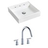 It features a square shape. This vessel set is designed to be installed as a wall mount vessel set. It is constructed with ceramic and it comes with an enamel glaze finish in white colour. It is designed for a 3h8-in. faucet.