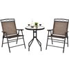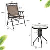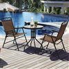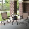 The 3-piece patio bistro set allows you to enjoy leisure time while sunbathing and having a coffee. The outdoor and indoor conversation set is made of breathable fabric, which is of high-resilience and ultra-comfortable. This portable folding chair set features a sturdy and highly durable yet lightweight steel frame and is equipped with a lock catch device for outdoor camping trips.