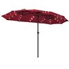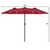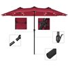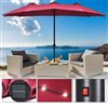The 15-ft solar patio double-sided umbrella provides ample shade to keep you cool and protect from the hot sun. Made of strong thick steel pole and 12 sturdy ribs, the solar LED patio twin umbrella is stable and durable for outdoor use. The premium fabric canopy is fade-resistant and water-proof. This solar double-sided umbrella comes with 36 built-in LED lights and premium solar panels for daytime and nightime use. Equipped with vents to add coolness and safety thanks to the additional airflow while reducing wind pressure. Assembly is easy andrequires no tools.