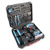 - The cordless tool kit includes 221 pcs: pliers, screwdriver handle, steel tape, knife, spirit level, hammer, wrench, drills, bits, bit holder, and 160 expansion tubes—everything you need in one kit