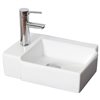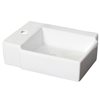 It features a rectangle shape. This vessel is designed to be installed as a wall mount vessel. It is constructed with ceramic. This vessel comes with an enamel glaze finish in white colour. It is designed for a 1 hole faucet.