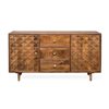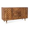 Style and function come together with this artfully designed sideboard. Crafted from mango wood, it features 2 doors boasting an intricately carved geometric pattern and 3 drawers that offer plenty of storage for all your linens, your dishes, and more. Gold capped wooden legs and gold handles complete the look, making this a great piece for your dining room, your living room or your entryway.