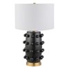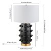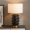 The bold silhouette of this table lamp is sure to become a focal point in your living room, bedroom, or workspace. The gently curved lines of the matte ceramic body are punctuated with spherical orbs, creating a textured, sculptural look. The fixture is finished off with a simple drum shade and classic brass base. Create a striking style moment in any room!