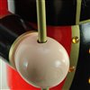 Nutcracker soldier wears a red black and gold uniform with decorative stripes and gems