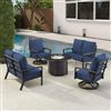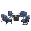 Oakland Living Lux Antique Copper Aluminum Patio Round Fire Table 2 Loveseats 2 Club Chairs Set w/ Blue Cushions