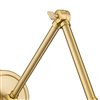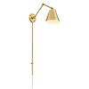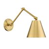 Gleaming modern gold finish metal brightens the studio-inspired design of a classic one-light wall sconce. Steel construction is true to its functional aesthetic, making the most of a wall-mounted light offering adjustable positioning of a cone shade. This fixture makes an excellent light for reading and task-mastering, as well as mood lighting ideal for a low-key setting.