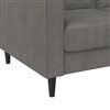 - Plush tufted seating, padded mailbox arms, and modern black sheen cone legs