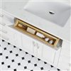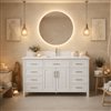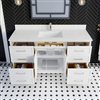 Upgrade your bathroom with a blend of modern design, smart storage, and durable craftsmanship. This premium freestanding vanity features a solid hardwood frame, an engineered stone countertop, and a sleek rectangular undermount ceramic sink for a timeless yet contemporary look. Soft-closing drawers and a patent-pending stealth organizer provide smooth functionality and organized storage. The 0.75-inch white engineered stone countertop with elegant grey veining is paired with a 4-inch backsplash to protect walls while adding a refined finish. Designed for easy installation, it includes contractor-friendly plumbing access, adjustable shelving, and customizable faucet configuration. Built with durable materials and premium zinc alloy hardware, it offers reliable performance and ample storage, backed by a 2-year limited warranty. Perfect for spa, master or guest bathroom upgrades. Note: Faucet, mirror, and pop-up drain not included.