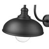 A capsule-style glass shade protects the light and offers charming flair to this modern industrial outdoor wall sconce. Designed with farmhouse character for inviting presence, it boasts a bold, decorative arm and domed shade, all in a textured sand black finish that adds durability you can count on.