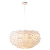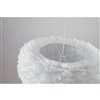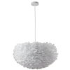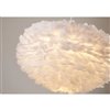 This unique ceiling fixture is in a white finish. The frame is made out of iron in white color, and it is surrounded by goose feather in white color. The adjustable cord link makes this fixture suitable for most ceiling heights.