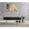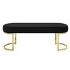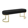 Dazzling metal and opulent velvet unite in the striking design of this bench collection. This gorgeous oval accent bench is comfortably padded and finished in plush velvet that is perfectly offset by the gleaming gold finish of the unique U-shaped open geometric frame. Upholstered in black or navy, this accent bench is a stunning addition to your contemporary décor.