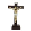 Depicts Jesus on a crucifix attached to a sturdy brown base