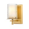 A sleek layered design blending glass and steel begins a look of elegance in this one-light wall sconce, a great option for contemporary bath spaces. Intricate detail is textural and artisan with clear glasswork in a cylinder shape, with an inner white diffuser. Etched opal and clear glass blend as they enhance stylish modern gold finish framing and show off a crisp mix of circles and lines.