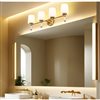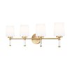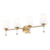 Bathed in a soft golden sheen, this modern gold 4-light vanity light offers an inviting glow that flatters both the room and everyone in it. The four opal glass shades line up like candles above the mirror, creating an even, flattering light that is bright enough for precise grooming while still feeling relaxed enough for a long soak in the tub. In a main bath, guest suite, or shared family space, this radiant fixture layers warmth and sophistication, making everyday routines feel a little more elevated.