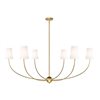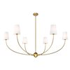 Modern design concepts count on versatility and style, and the Shannon six-light chandelier complies with a glowing, rich finish palette. This contemporary fixture features gorgeous rubbed brass finish steel framing with gracefully curved arms, a center orb accent, and traditional white fabric shades capping each candelabra lamp. Perfect for dining spaces, living areas, and entryways, this sophisticated chandelier is a natural choice.