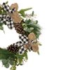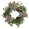 Add this bright and cheery wreath to your already existing Christmas decor this year. Perfect to hang on your door or on any wall in your home. Product Features: Magnolia and pine cone Christmas wreath. The wreath is accented with black and white plaid and burlap leaves. Black and white plaid leaves green leaves and pine cones accent wreath. No assembly required - wreath comes in 1 piece. Natural vine circular twig backing for hanging. Recommended for indoor use or covered outdoor use. Dimensions: 22-in diameter (measured from outermost tip to outermost tip across the wreath). Material(s): twig/plastic. Note: Branches are compressed for shipment and need to be fluffed out upon arrival to look like the photo.