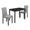 This casual dining set offers a classic styling that will compliment any decor. Perfect for small spaces, the rectangle dining table features an ample surface area with two solid wood legs. The comfortably padded dining chairs are finished in an elegant and durable gray linen material. The simple lines of this dining set with a rich black finish create a timeless look that you will love.