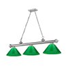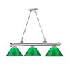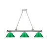 - The elegant sheen of a brushed nickel finish and the colourful appeal of green plastic shades add an edge of modern character to this three-light steel billiard light