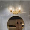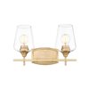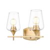 Side-by-side goblet shades crafted of delicate clear glass make a statement in this 2-light vanity light featuring luxe burnished brass finish steel framing. Sophistication and timeless style merge to offer a light fixture making itself at home in bathrooms, dressing spaces, and open living areas. This dimmable light fixture makes changing lighting levels a breeze.