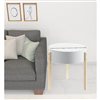 Distinctive in style the 21-in natural brown and white manufactured wood and solid wood round end table radiates a versatile charm. The base of this table is made from solid wood in a natural brown colour that is a nice contrast to the white manufactured wood tabletop. A great accent on either side of the sofa or bed, this adorable end or side table is just what you need. This versatile table is a great accent for most any room.