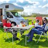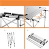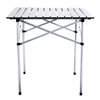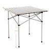 28-in Square Portable Roll Up Camping Table, which is ideal for family reunions, picnics, camping trips, buffets or barbecues. The table is made of aluminum with metal legs. This makes it spill and weather resistant, sturdy and easy to clean. Due to its full roll-up design, it saves space and time and is also convenient for transport and storage.
