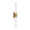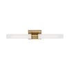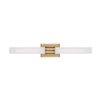 Sleek and modern, this 2-light bath series pairs a square backplate with tubular etched white opal glass shade. The Keaton two light vanity fixture in Satin Brass provides abundant light for your bath vanity, while adding a layer of today's style to your interior design.