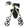 This silver Empower rollator is made of aluminum with memory foam seat. The padded backrest flips forward and backward enabling the user to sit comfortably on either side. This rollator includes a folding cup holder and neoprene storage bag.