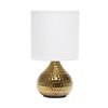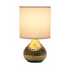 A stunning hammered metallic base is the trademark for this stylish table lamp. With a fabric drum shade to complement the pear-shaped base, this lamp is designed to sit perfectly atop your furniture of choice! Simple yet exquisite, this lamp is everything you're missing in your home.