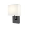 Add a spirited contemporary look with light style, choosing this 1-light metal sconce to infuse targeted lighting in a modern bath or living space. This light from the Saxon collection features a clean silhouette with a backplate and arm made of matte black finish steel and a box shade wrapped in crisp white fabric.