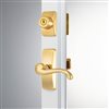 This deluxe storm door hardware set includes an elegant lever handle, interior latch, and keyed deadbolt. It is compatible with most pre-installed surface mount handles, and complements a wide range of décor styles. Please note that it does not replace any other mortise handle sets. The elegant and easy to operate handle replaces the basic push button handle that may already be on your screen door. The interior latch features an easy opening push movement. The matching keyed deadlock lock is not a high-security lock, but a secondary level of security that provides additional security. The long-lasting finish will provide an added touch of class to any storm door. This set includes everything needed for installation and will fit doors from 1 to 2-1/8-in thick. Installation should take about 30 minutes. When replacing an existing handle, the screw posts for the handle must be 1-3/4-in apart. For new installations, three additional holes are required to be drilled through the door for the screws and spindle. The lock can be installed above or below the handle, depending on your preference. The spindle for the deadlock may be cut for your particular installation. A tape measure, drill and screw driver will be required. A centre punch to mark the holes is helpful. Before drilling, ensure that the inside latch and lock do not interfere with the operation of your main door handle. If they do, raise or lower the storm door hardware.