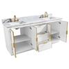 The Austen collection features a minimalist design that pops with colour thanks to the refined white finish with matte gold trim and hardware. The vanity features a solid wood birch frame, plywood drawer boxes, dovetail joints, a toe kick for convenience, soft-close glides and hinges, a Carrara white marble top and dual rectangular undermount sinks.