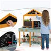 This kitchen playset comes with 2 stoves, 3 burner knobs, a functional faucet, and a removable sink to simulate cooking or washing. There are 2 blackboards for kids to write and doodle. A special root viewer planter lets kids see the entire life cycle of different plants. Storage shelves help children to develop organizational skills. Constructed of strong fir wood, this kitchen playset ensures strength and durability. The playset is suitable for both indoor and outdoor use.