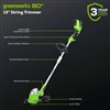 Welcome to a Life. Powered. by Greenworks. Kick gas to the curb and go green with no fumes, no mixing, no maintenance, and no pull cords. The Greenworks 40V lithium-ion platform powers over 60+ products, including lawnmowers, blowers, string trimmers, chainsaws, hedge trimmers, and much more! Delivering the power you need with fade-free performance and no memory loss after charging. Start with a tool kit, then add tool only equipment. This weed trimmer can be used with all Greenworks 40V battery models (sold in Canada)! Let Greenworks help you take the work out of yard work. Trim your lawn with ease using the Greenworks 40V 13" String Trimmer (Tool Only). This cordless grass trimmer features a 13-inch cutting path, rotating head for edging and a single line auto feed trimmer head design. Built to last; The Greenworks 40V platform comes with a 3-year tool & battery warranty to protect your investment.