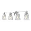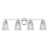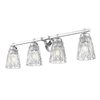 Decadence is on display with a 4-light vanity light suited to larger master or guest bath settings, offering dimmable light levels to capture enhanced mood impacts. Textural diamond patterning on clear glass conical shades tells a story of lighting impacts, with brilliant chrome finish metal framing providing a timeless anchor.
