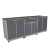 This outdoor kitchen cabinet includes two cabinets with 2 doors and one cabinet with a drawer and 2 doors. It also comes with the standard size stainless steel top and adjustable feet. Drawers and doors are equipped with a soft close system.