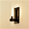 The clean design offers a sleek contemporary style with industrial influences. This single light wall sconce comes with a cylinder glass shade set against a black finish backplate, resulting in a refined modern look, convenient and versatile.