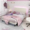 Upgrade your bedroom with this queen platform bed frame, a modern and functional addition designed for comfort and convenience. Featuring a chic 22.6 in. tall, upholstered headboard with geometric stitching, this bed offers a stylish focal point and extra back support. Its integrated charging station includes 2 USB ports and 1 Type-C port, making it easier than ever to keep your devices charged. The RGB LED lighting allows you to adjust colours and brightness, transforming your space with customizable lighting effects to suit any mood. Built with a robust metal frame and reinforced wooden slats, this bed supports up to 800 lbs., ensuring durability and stability. With a low-profile design and easy assembly, it's ideal for bedrooms, guest rooms, or dorms.