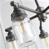 Classic mason jar design elements of the Aries collection pendant lights featuring silver brushed black finish, water pipes shape frame and 5 clear glass jars as the shade. It is attractive design in industrial, rustic or traditional home style. Coordinate with other farmhouse-style lighting of dining areas, staircase, entryway,foyer, kitchen, living room and bedroom for a stunning look.