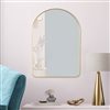 Measuring 24 by 36-in, this striking arched piece features a durable aluminum frame in a radiant gold finish that complements both modern and classic interiors. The high-definition glass provides a crisp, clear reflection, while the 1-in deep frame adds a touch of architectural sophistication to your bathroom, living room, or entryway. Designed to instantly brighten and expand your space, this mirror arrives ready to hang and serves as a durable, stylish centrepiece for any contemporary wall.