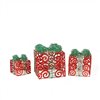 Get into the holiday spirit with this gift box set. This set features elegant-looking pre-lit gift boxes are red swirls with green bows and accented with glitter. These will be the perfect addition to your porch entryway tabletop, or anywhere you wish to add a little holiday charm. Product Features: Christmas gift boxes decoration. Pre-lit with 54 clear lights. Bulb size: mini. Bulb type: incandescent. 55-in red lead cord. If one bulb burns out the rest will stay lit. Contains 1 plug with an end connector which allows you to stack multiple lighted items together (210-watt max). Comes with replacement bulbs and spare fuses. Some assembly required; ground stakes not included. UL approved and certified for indoor or outdoor use. Recommended for outdoor. Lights per box: Small: 10 lights. Medium: 20 lights. Large: 24 lights.