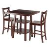 The 3-piece Orlando high table and V-back stool set combines simplicity and function. The set is a great addition to a dining area, eat-in kitchen, or family room for cards and board games. The table features 2 shelves that offer generous storage space for dishes, glassware, and other dining accessories. Finished in a rich walnut, the table is made of solid and composite wood for long-lasting stability. Assembly required.